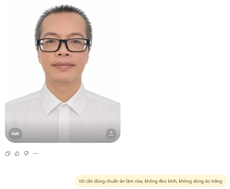 Muốn đạt yêu cầu, bạn cần cho "câu lệnh" chi tiết hơn, ví dụ "tôi cần đúng chuẩn ảnh làm visa, không đeo kính, không dùng áo trắng"