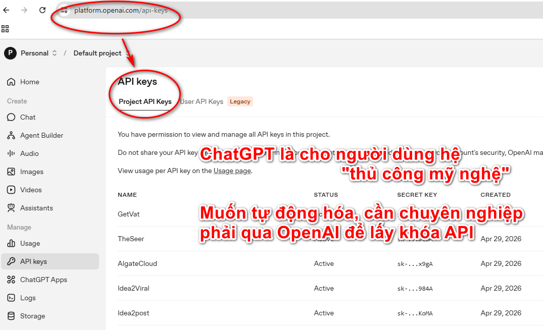 Trước tôi không để ý, dùng chung 1 mã, nghĩ là tiện. OpenAI vừa báo là vi phạm chính sách, họ tưởng là spam hay mình chia sẻ key cho ai, nên tôi vừa phải tách ra mỗi trang web một mã API riêng.