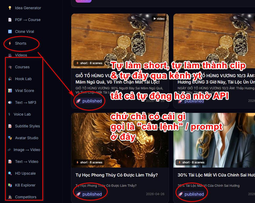 H5. Đây là ví dụ trang khác Idea2viral.com tự động hóa quy trình lấy nội dung, lên kịch bản (ai mà dùng prompt thì dở hơi rồi), tự tạo clip, tự chọn giọng (có chế độ clone giọng nói), rồi tự đăng lên các kênh như yt hay tiktok.