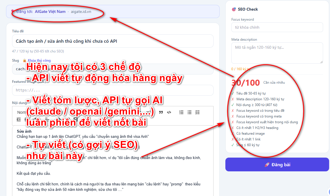 Hiện có 3 chế độ: viết tay thủ công (như bài này), nghĩ ý chính rồi AI viết lại, và tự động hóa hàng ngày (cái này lấy từ Idea2post sang)
