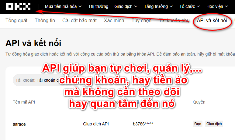 Tôi đang dùng để làm sàn trading riêng. Như bên dưới bạn thấy có quyền "Đọc - lấy thông tin" và "Giao dịch - mua / bán các kiểu"